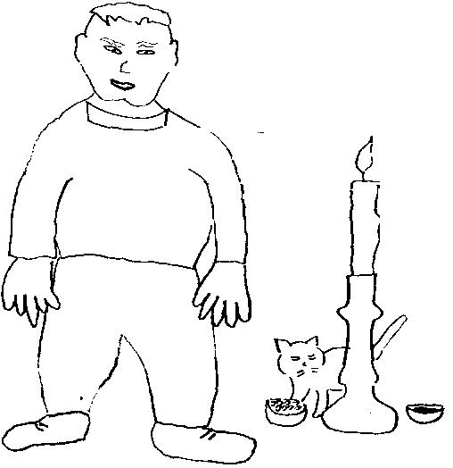 toen hij eenmaal aan het schemerige licht gewend was: er stonden bakjes met melk en brokken