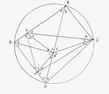 We want to prove that these 25 equations together with the premises e+d-u = 90 = b+c-v imply j-a = w-f , which is equivalent to the existence of M on AH such that MH = MS = MT.